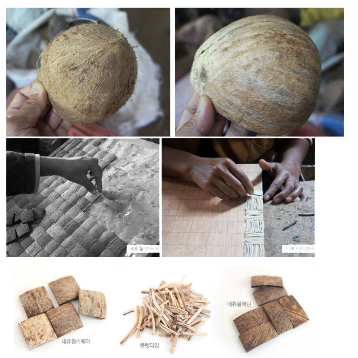 ココナッツの皮を貼りあわせて作ったココナッツタイル。なかなか面白い素材をもっているECOHOME社です。手作業で製造したもの…